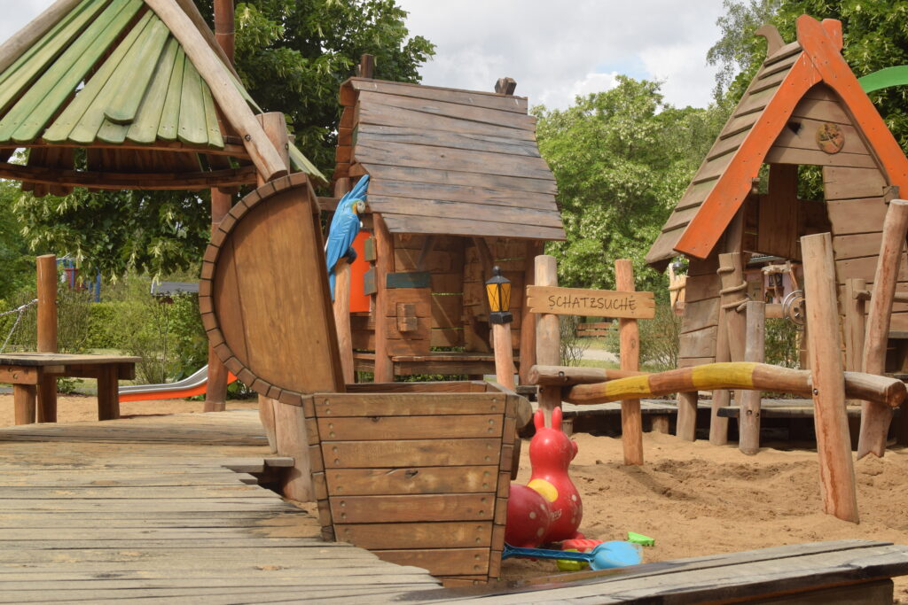Der Spielplatz ist recht neu und im Piratenthema gehalten. Er ist so vielfältig, dass die Kinder hier einige Zeit beschäftigt sind. Weiter hinten im Park gibt es dann, wetterabhängig, noch Hüpfburgen. Außerdem habt ihr die Möglichkeit vor Ort euch Schläger für je 3,50 € auszuleihen und Minigolf zu spielen.