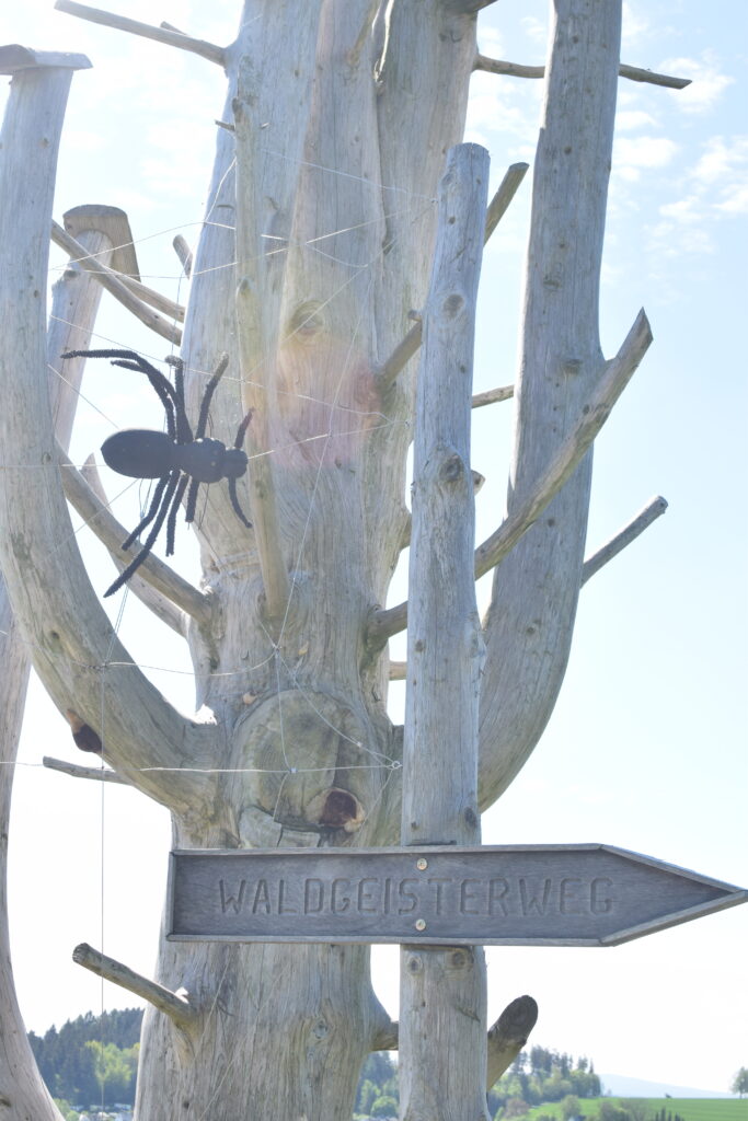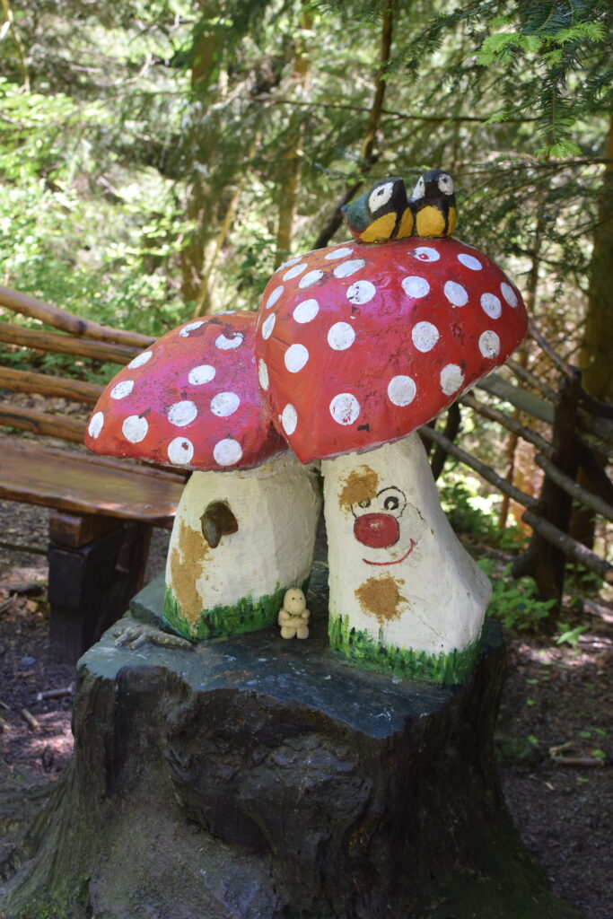 Der Weg ist gesäumt mit kreativen Waldgeistergestalten. Diese werden fast jedes Jahr ergänzt und die Namenstaufe lässt einen das ein oder andere Mal schmunzeln.